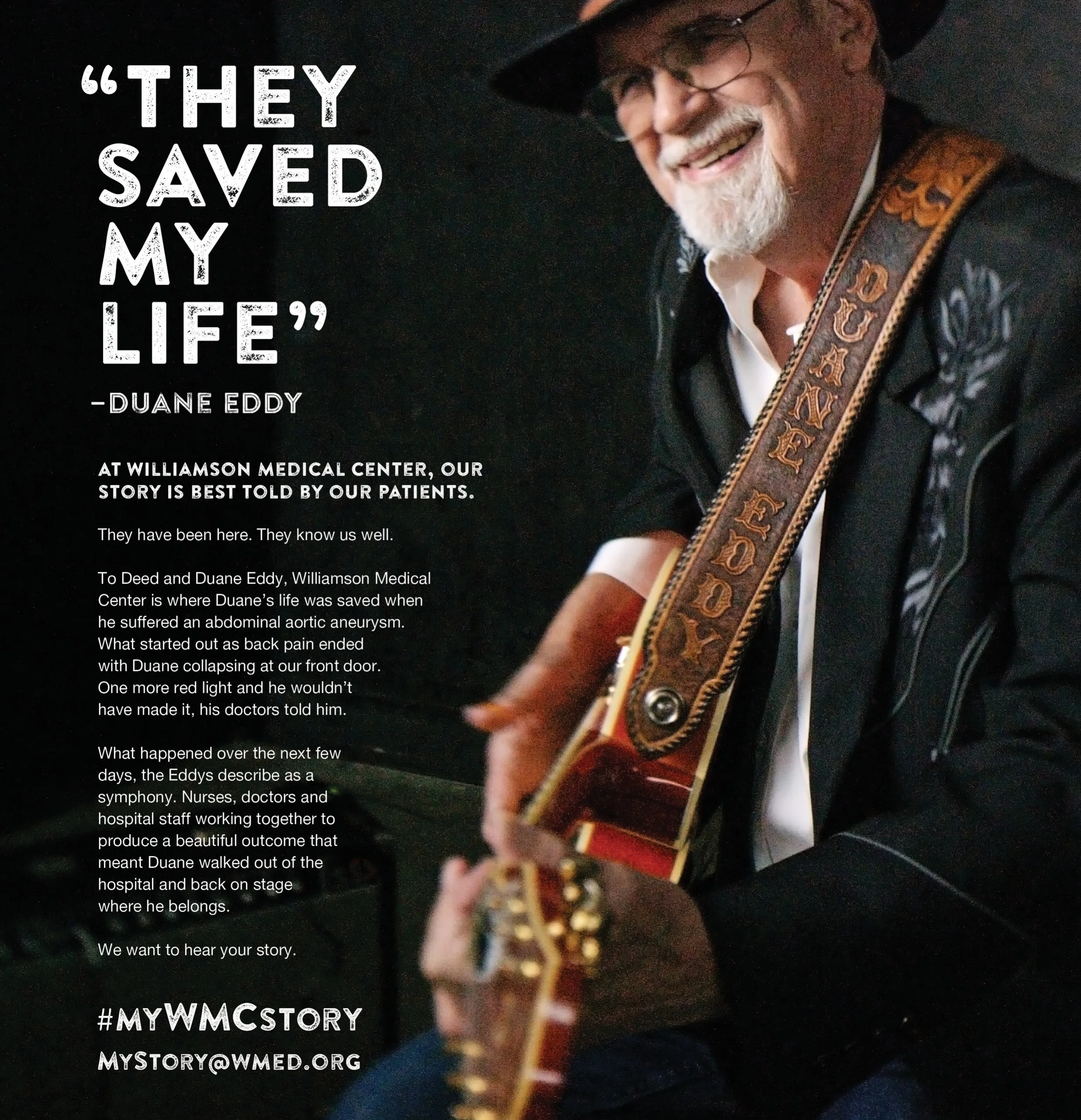So how do you tell all the stories a top-notch medical center has to tell and make everyone happy while being effective? You find a rock star legend who had a deadly aortic aneurysm but was saved and brought back to his former glory thanks to an amazing medical staff and is willing to share his story. Then you condense a 2-hour interview into four words. Add in a slammin' photograph, the finesse of a great designer and some elite real estate high above a major interstate right at the medical center's front door. It's that simple.